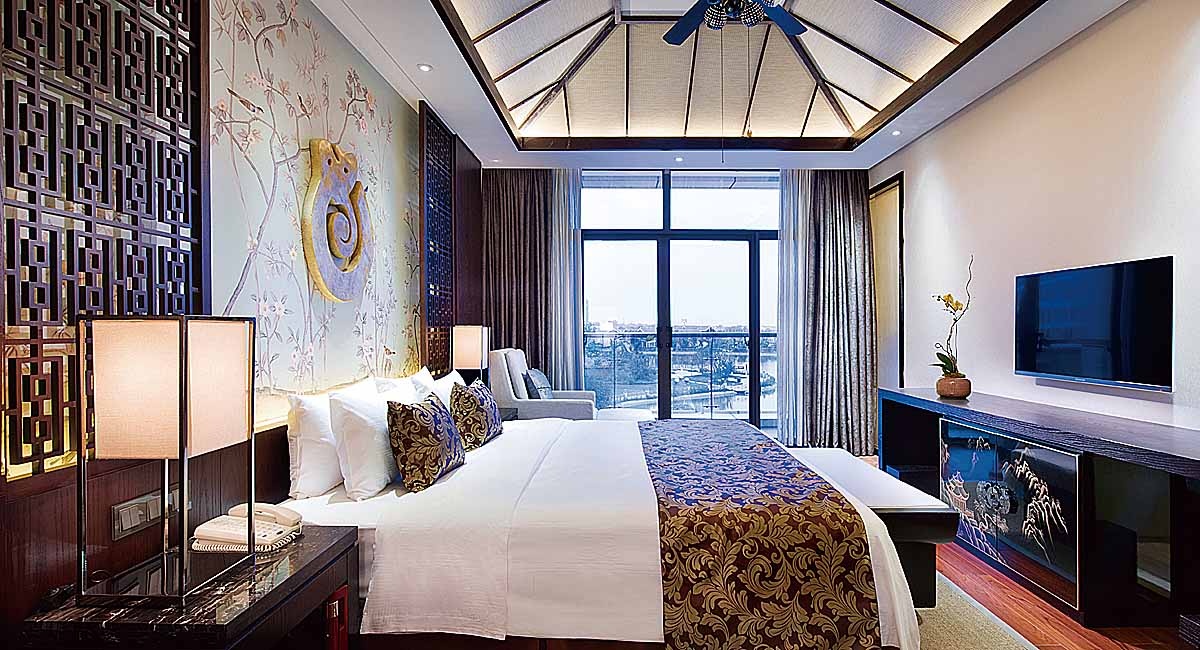 藍溪度假大酒店將古代建筑的經典元素提煉并加以豐富,借鑒現代建筑風格的時尚與潮流,以現代人的審美需求來打造富有傳統韻味的空間,給傳統居住文化注入了新的氣息。無論是寫意的休息室,還是詩意的套房,都追求人與環境的美學與和諧共生:講究居住環境的穩定、安全和歸屬感。